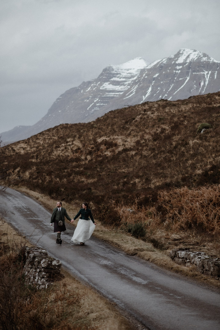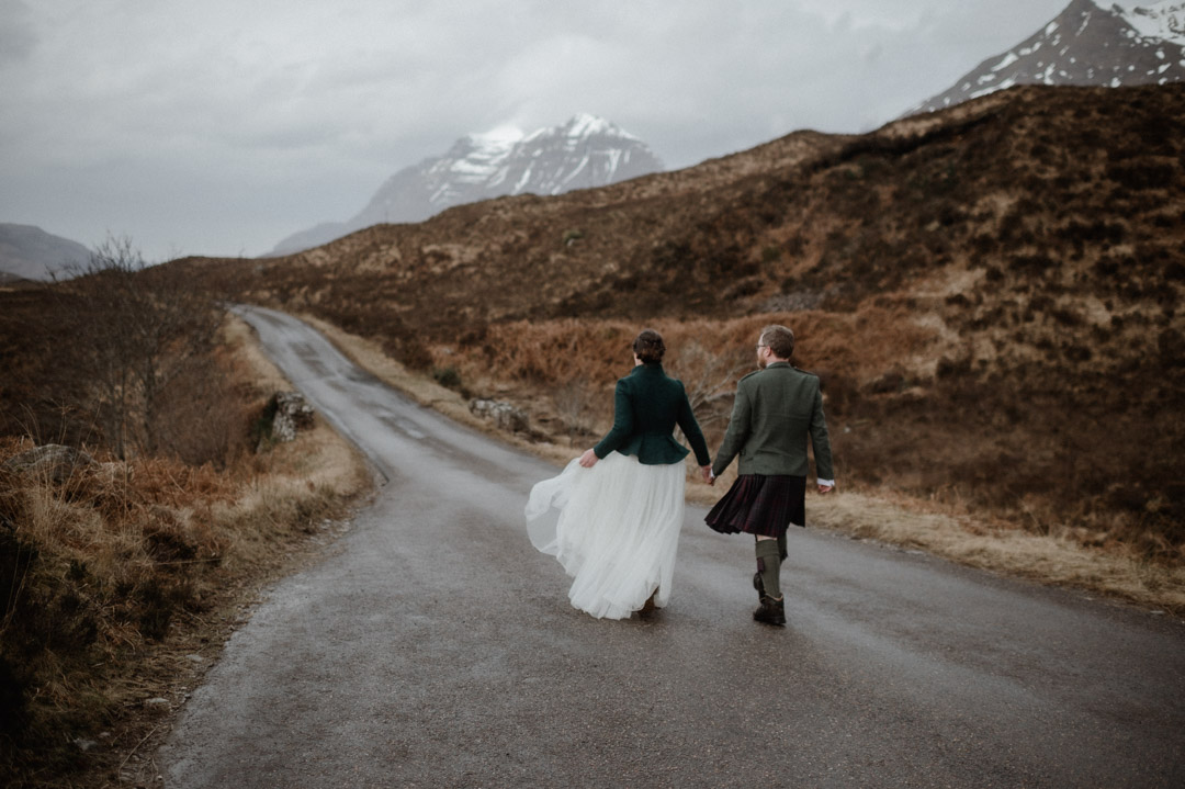 Adventuring in wedding outfits during winter in Torridon